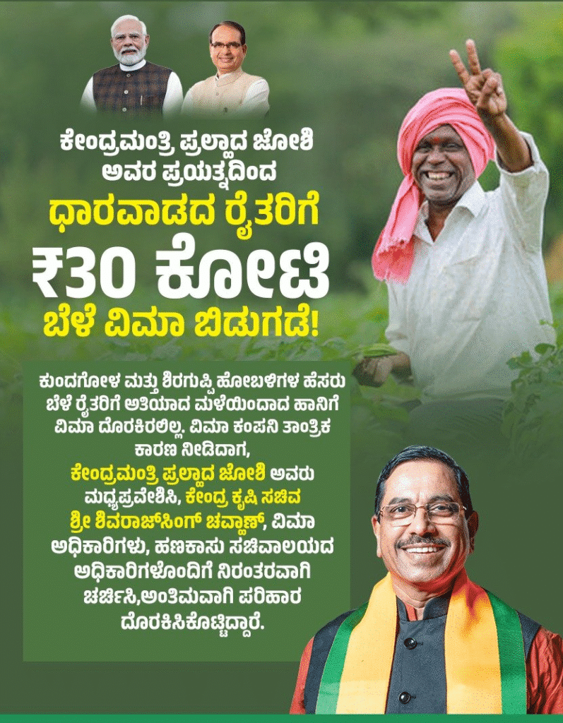ಕೇಂದ್ರ ಸಚಿವ ಪ್ರಲ್ಹಾದ ಜೋಶಿ ಅವರು ಅಧಿಕೃತವಾಗಿ ಹಂಚಿಕೊಂಡಿರುವ ಮಾಹಿತಿಯ ಪ್ರಕಾರ ಕಳೆದ ಮುಂಗಾರಿನಲ್ಲಿ ಬೆಳೆ ವಿಮೆಯನ್ನು ಪಡೆಯಲು ಅರ್ಹರಿದ್ದ ಕುಂದಗೋಳ ಹಾಗೂ ಶಿರಗುಪ್ಪಿ ಹೋಬಳಿಗಳ ರೈತರಿಗೆ ಪ್ರಸ್ತುತ 30 ಕೋಟಿ ಬೆಳೆ ವಿಮೆಯನ್ನು ರೈತರ ಖಾತೆಗೆ ನೇರ ನಗದು ವರ್ಗಾವಣೆ ಮೂಲಕ ಜಮಾ ಮಾಡಲಾಗಿದೆ ಎಂದು ಮಾಹಿತಿಯನ್ನು ಹಂಚಿಕೊಂಡಿದ್ದಾರೆ.