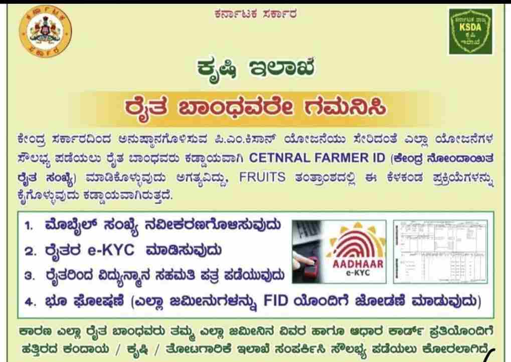 ವಿಶೇಷ ಸೂಚನೆ: ಯಾವ ರೈತರು ಈ ಮೇಲಿನ ಪ್ರಕ್ರಿಯೆಯನ್ನು ಪೂರ್ಣಗೊಳಿಸುವುದಿಲ್ಲವೋ ಅಂತಹ ರೈತರಿಗೆ ರಾಜ್ಯ ಹಾಗೂ ಕೇಂದ್ರ ಸರ್ಕಾರದ ಯಾವುದೇ ಸಹಾಯಧನಗಳು ನೇರವಾಗಿ ಬ್ಯಾಂಕ್ ಖಾತೆಗೆ ಜಮೆಯಾಗುವುದಿಲ್ಲ.